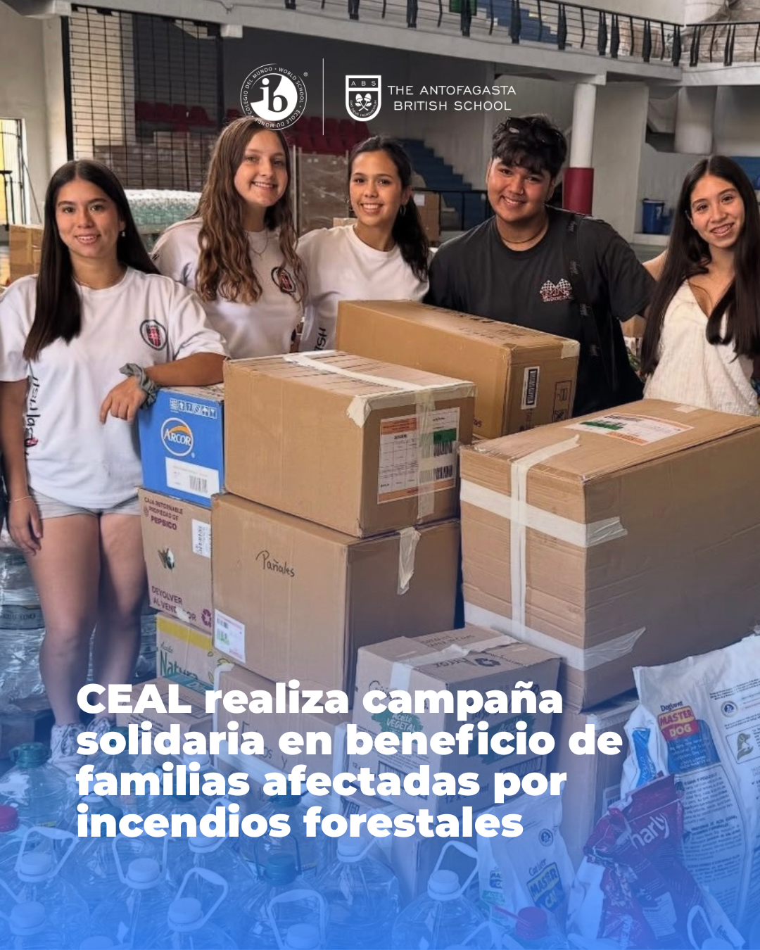 En un importante gesto de solidaridad, el Centro de Alumnos (CEAL) de nuestro colegio, en conjunto con el Colegio Chañares, Colegio San Luis y Antofagasta International School, llevó a cabo una campaña de recolección de ayuda destinada a las familias afectadas por los incendios en el sur de Chile. Esta iniciativa tuvo como principal objetivo reunir insumos esenciales, convocando a toda la comunidad educativa para contribuir con quienes más lo necesitan en un contexto de emergencia.